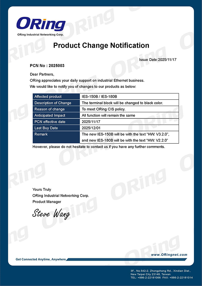 Product Change Notification:IES-150B,IES180B terminal block change