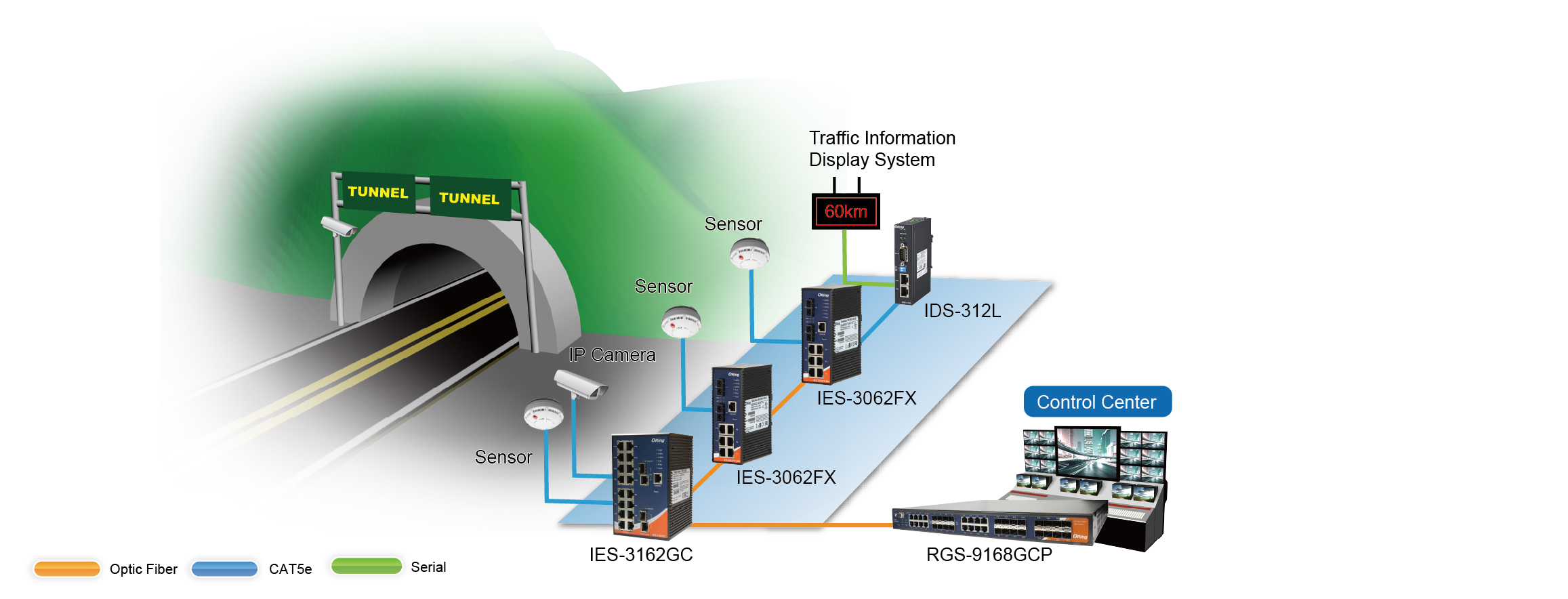 IP cameras installed inside the tunnel are connected to the IES-3162GC switches, which aggregate and transmit high-bandwidth video streams through fiber links.